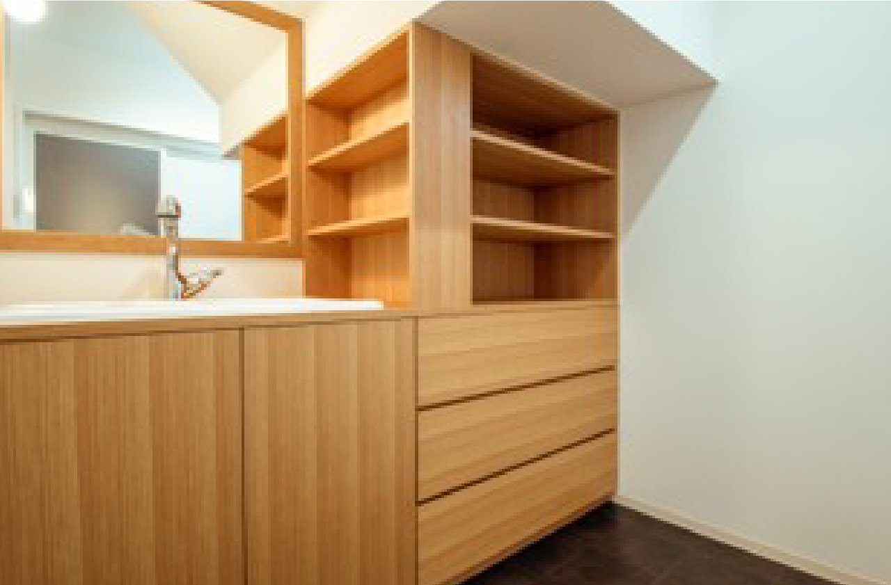 「シンプルでかっこいい」世界観を完結させるために、私たちは建物だけでなく、その中に置かれる家具までトータルでご提案します。キッチンカウンター、収納棚、洗面台など…、お客様のライフスタイルに合わせて設計することで、住みやすさが格段にアップします。また、造作家具と一緒に家のインテリアまでトータルコーディネートすれば、既製品では出せない統一感も出すことできます。