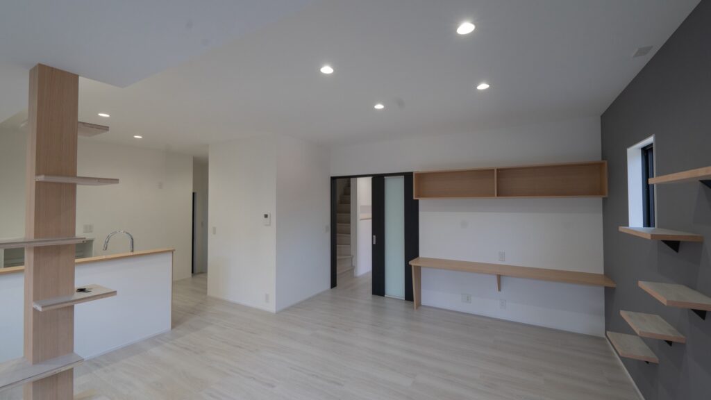 室内は、南側の日当たりのよいリビングの一角に、親子がさまざまな用途で使える収納付カウンターを造作。