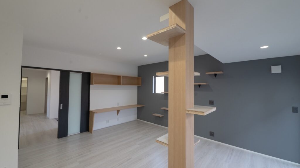 「キャットウォークをつけたい!」というお施主様のご希望を叶えるため、猫ちゃんの普段の動きや性格をじっくりヒアリングして設計。床材には、猫ちゃんが走り回っても滑りにくい素材を採用しています。
