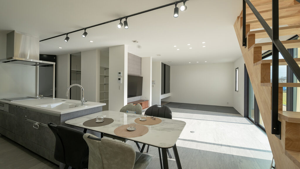 LDKは、グレーの濃淡が美しく映えるコーディネートがポイント。マットなブラックの建具がアクセントとなり、空間全体をクールに引き締めます。