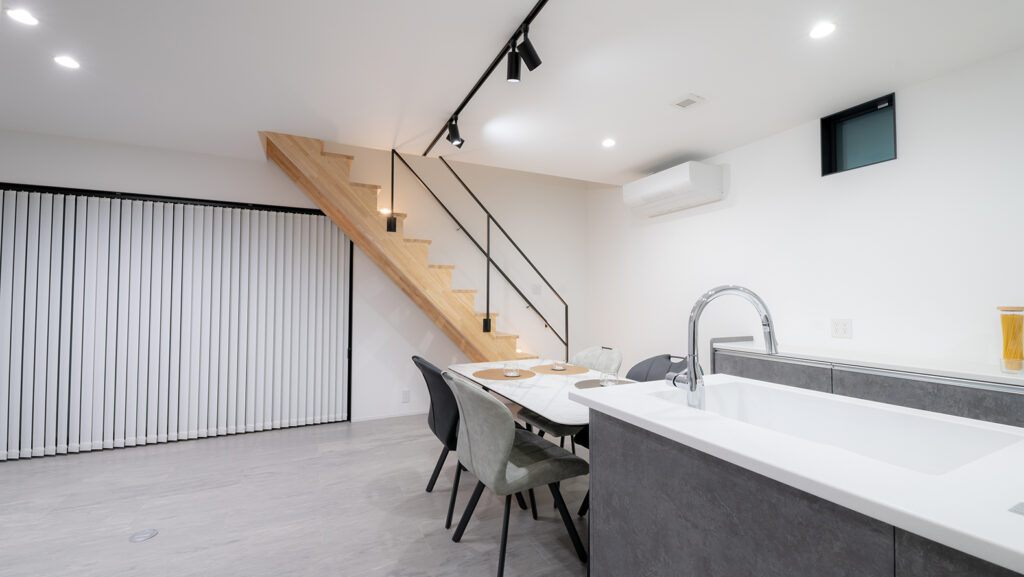 ダイニングの一角には、柔らかな印象をプラスする木製のスケルトン階段を取り入れました。無機質素材の空間に、一箇所、温かみのある木質素材を取り入れることで、ずっと居たくなるような、我が家の心地良さも足先から感じられるようにしました。