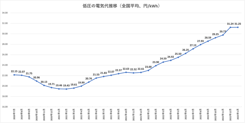 上記は、電気代の全国平均の推移を示したグラフです。