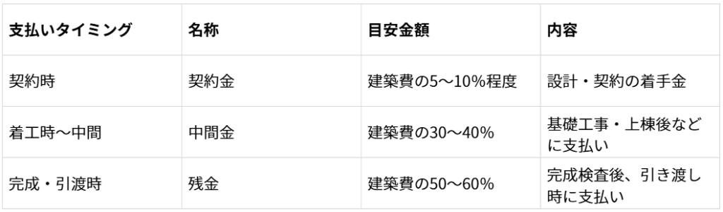 建築費以外にも、契約金・中間金・登記費用など、思ったよりも支払いの時期は分かれています。