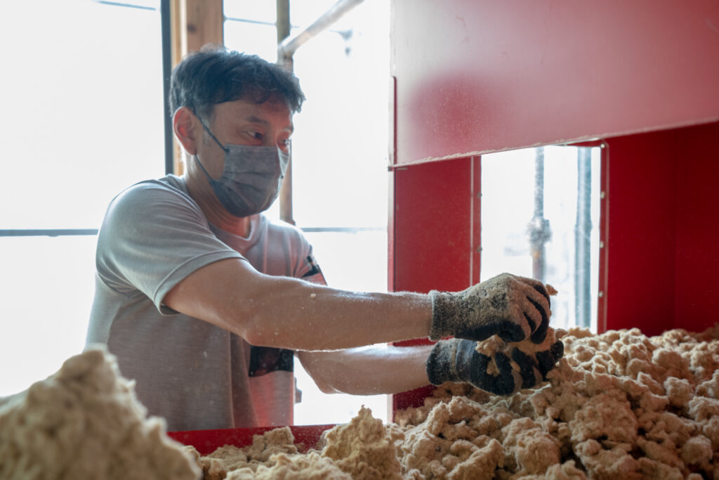 実際に尚建の工務が断熱材を施工している様子がこちら↓