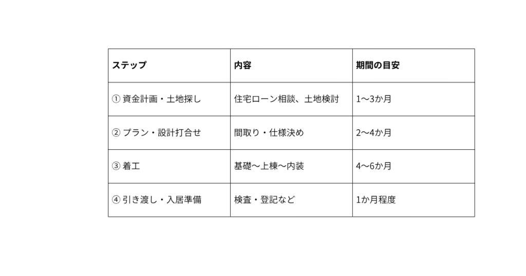 家づくりは「計画 → 設計 → 施工 → 引き渡し」の4段階。