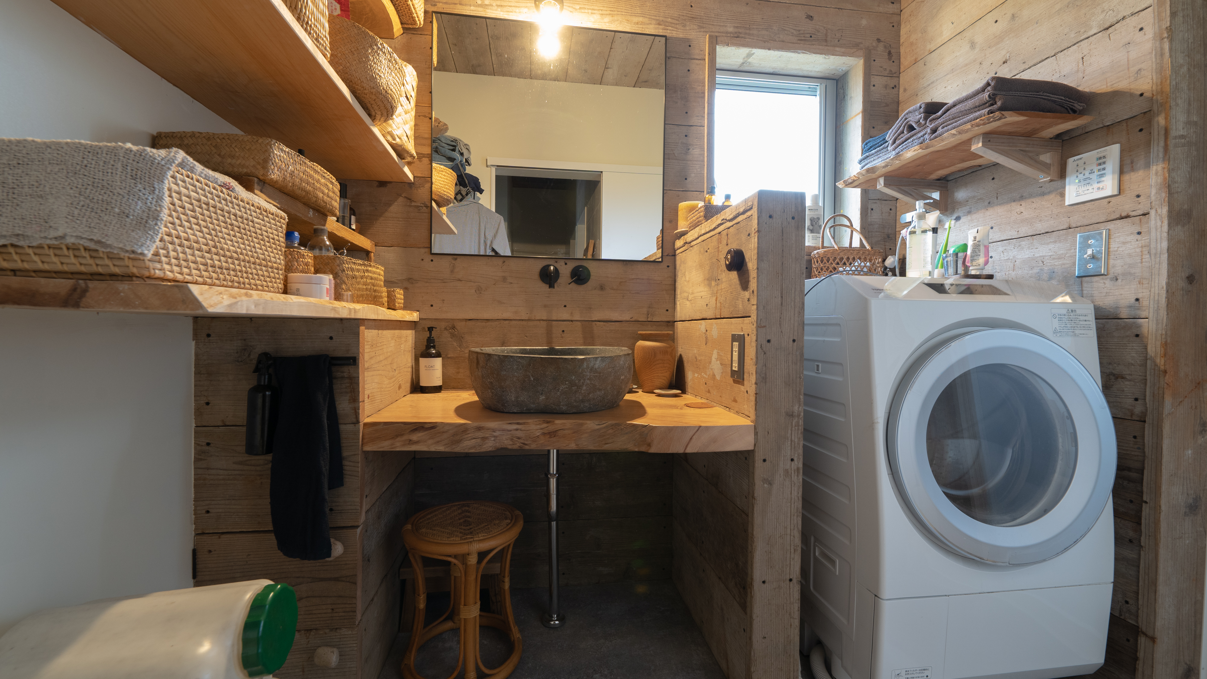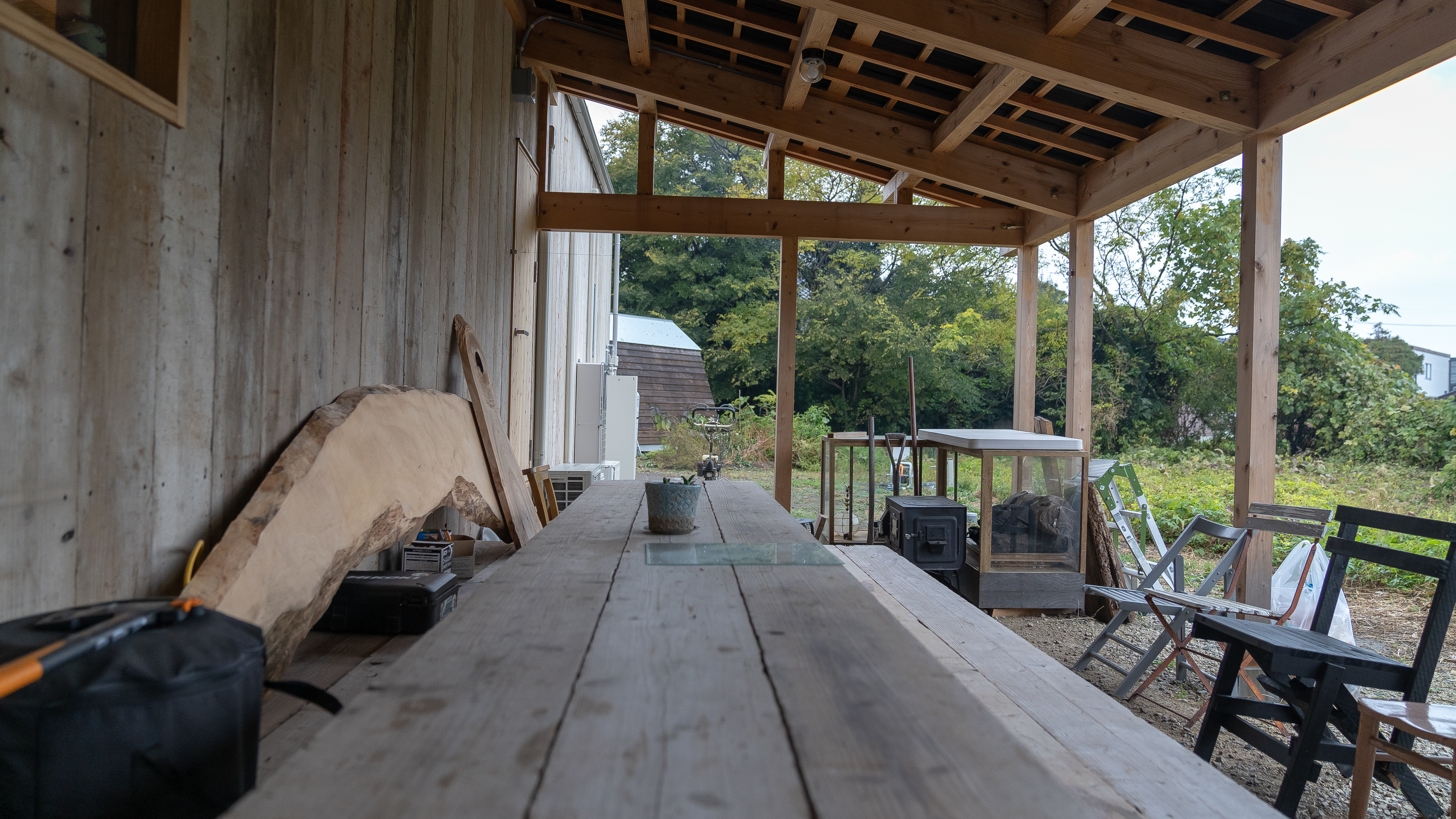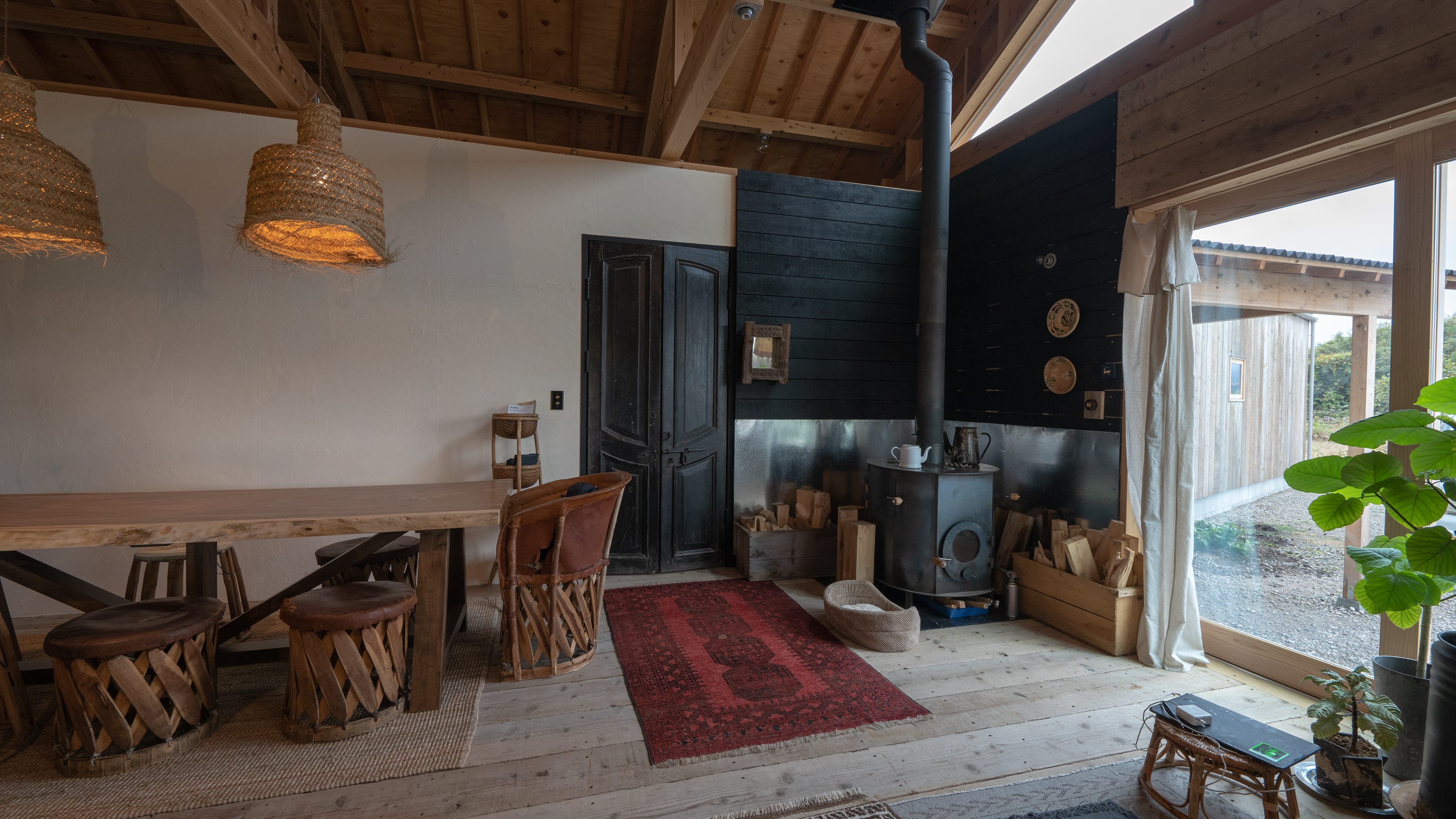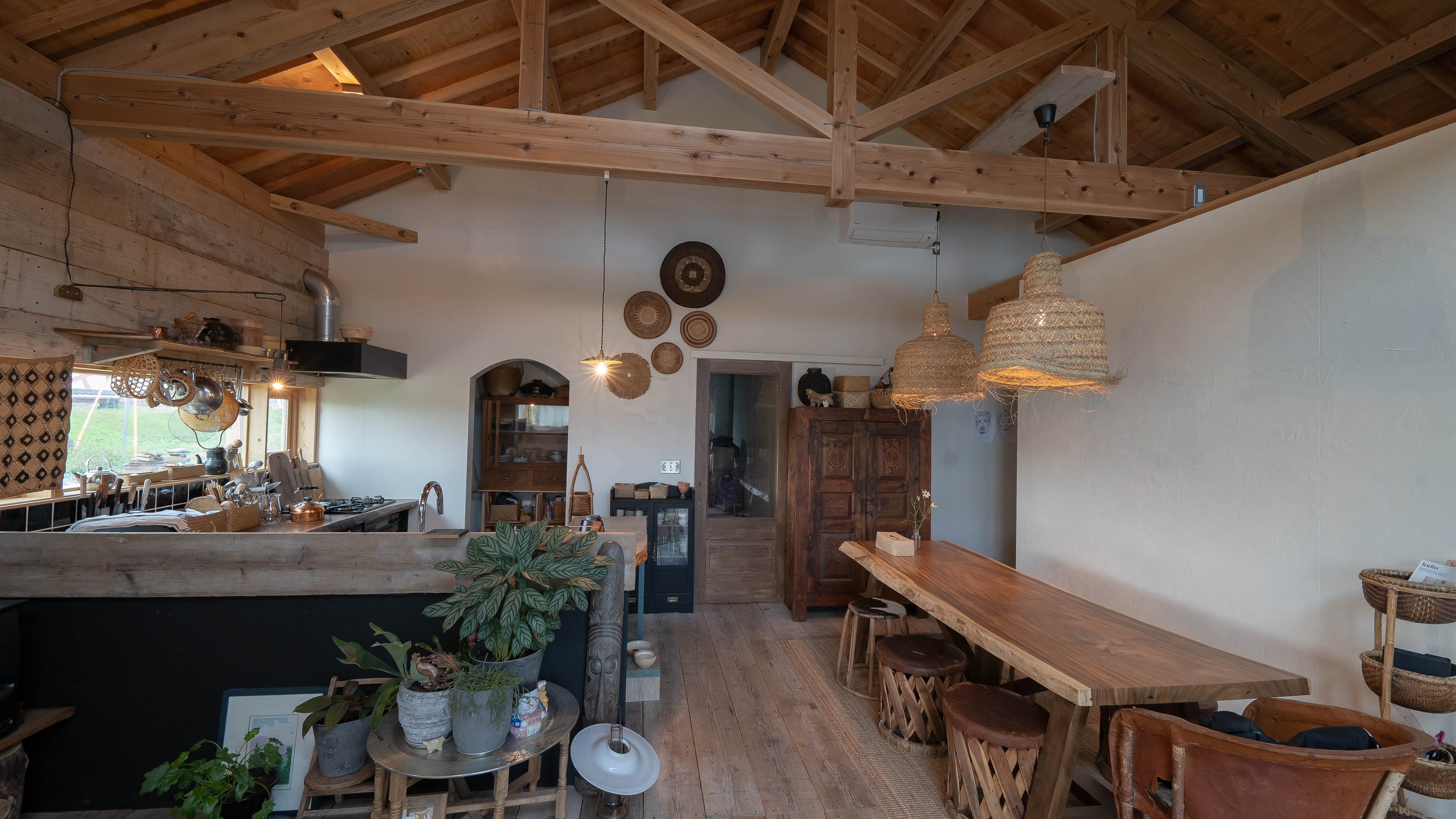 天井の梁や垂木をそのまま見せることで、空間にダイナミックな奥行きと、古民家のような温かい安心感を与えます。
